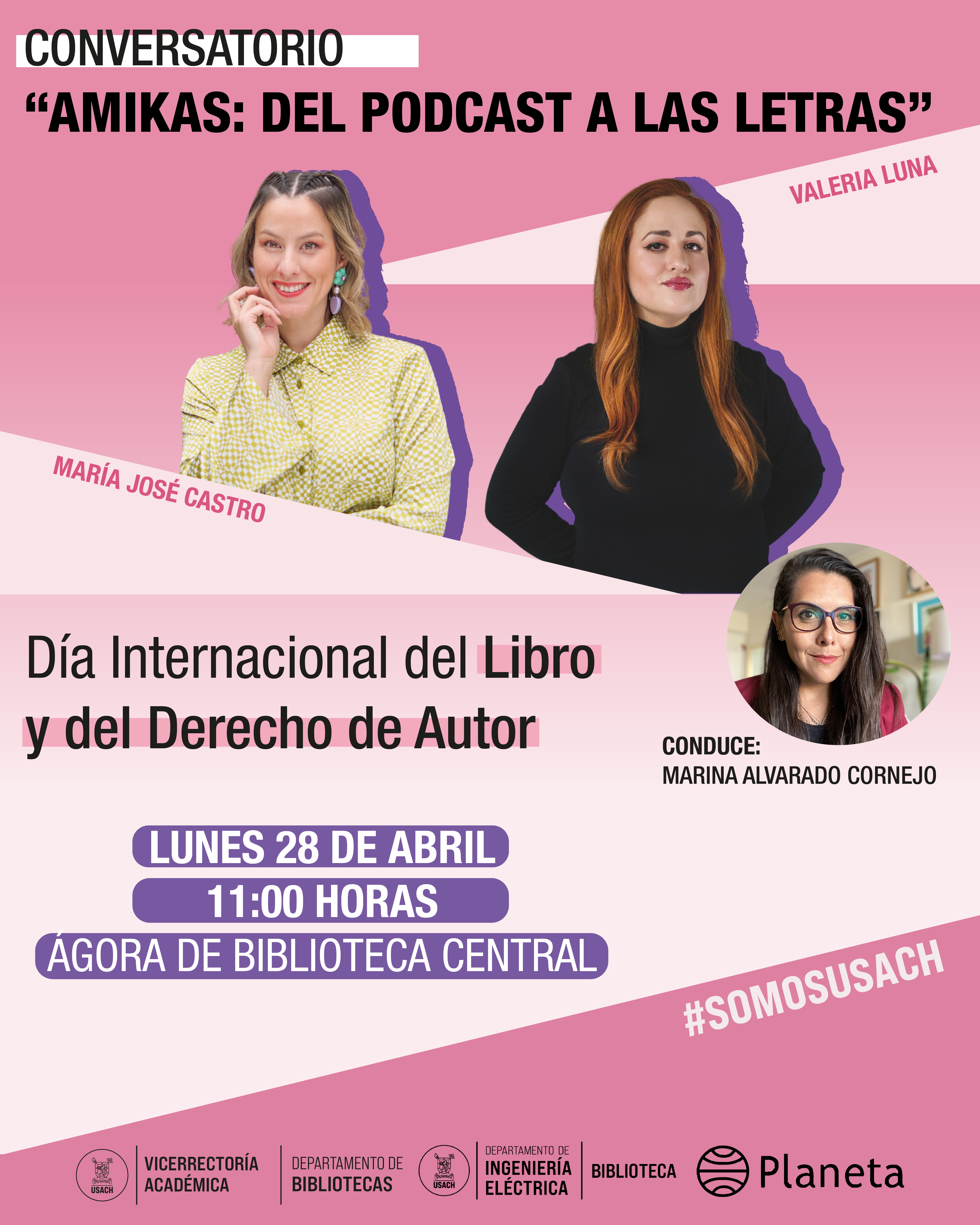 En celebración al Mes del Libro y del Derecho de Autor, el Departamento de Bibliotecas Usach ha organizado un interesante conversatorio "Amikas: del podcast a las letras", junto a las autoras María José Castro y Valeria Luna.