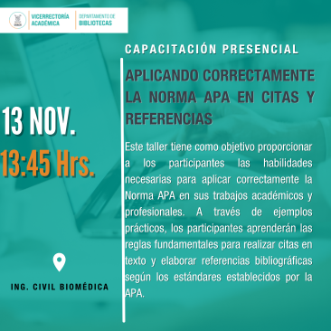 Este taller tiene como objetivo proporcionar a los participantes las habilidades necesarias para aplicar correctamente la Norma APA en sus trabajos académicos y profesionales. A través de ejemplos prácticos, los participantes aprenderán las reglas fundamentales para realizar citas en texto y elaborar referencias bibliográficas según los estándares establecidos por la APA.
