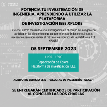 Los invitamos a participar en la capacitación de Xplore: plataforma de investigación de IEEE. La capacitación se realizará el día martes, 5 de septiembre, a las 11 AM, en el Auditorio Edificio ESID, ubicado en Avenida Víctor Jara 3524.