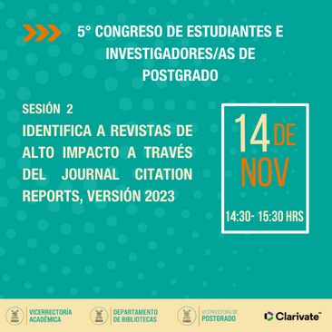 Te invitamos a participar en la capacitación online “Identifica a revistas de alto impacto a través del Journal Citation Reports, versión 2023”. El cual se llevará a cabo el día martes 14 de noviembre a las 14:30 hrs.