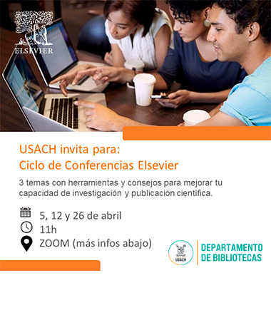 La unidad de Recursos Digitales del Sistema de Bibliotecas Usach junto a Elsevier, editorial científica, especialista en contenido académico especializado, invitan a la comunidad usachina a la realización de un ciclo de tres capacitaciones que proporcionarán herramientas y consejos para mejorar su capacidad de investigación y publicación científica. Si bien la actividad es abierta a toda la comunidad usachina, estas tres capacitaciones pueden ser una excelente oportunidad para académicos/as e investigadores/as. La participación en estas capacitaciones incluye certificación por parte de la editorial.