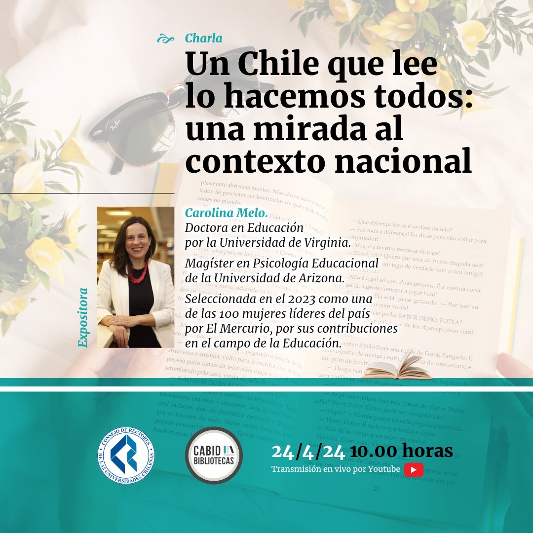 Con motivo de la celebración del Día Internacional del Libro y del Derecho de Autor, la Comisión Asesora de Bibliotecas del Consejo de Rectores de Universidades Chilenas (CRUCH) llevará a cabo una charla titulada «Un Chile que lee lo hacemos todos: Una mirada al contexto nacional», impartida por la destacada educadora Carolina Melo. Melo es Doctora en Educación por la Universidad de Virginia y Magíster en Psicología Educacional de la Universidad de Arizona. Además, fue seleccionada en el 2023 como una de las 100 mujeres líderes del país por El Mercurio, reconocida por sus significativas contribuciones en el campo de la educación.