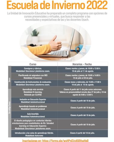 La Unidad de Innovación Educativa de la Vicerrectoría Académica tiene el agrado de invitarles a participar de la Escuela de Invierno 2022, que inicia el 11 de julio y reúne una amplia variedad de cursos presenciales y remotos, síncronos y asíncronos.