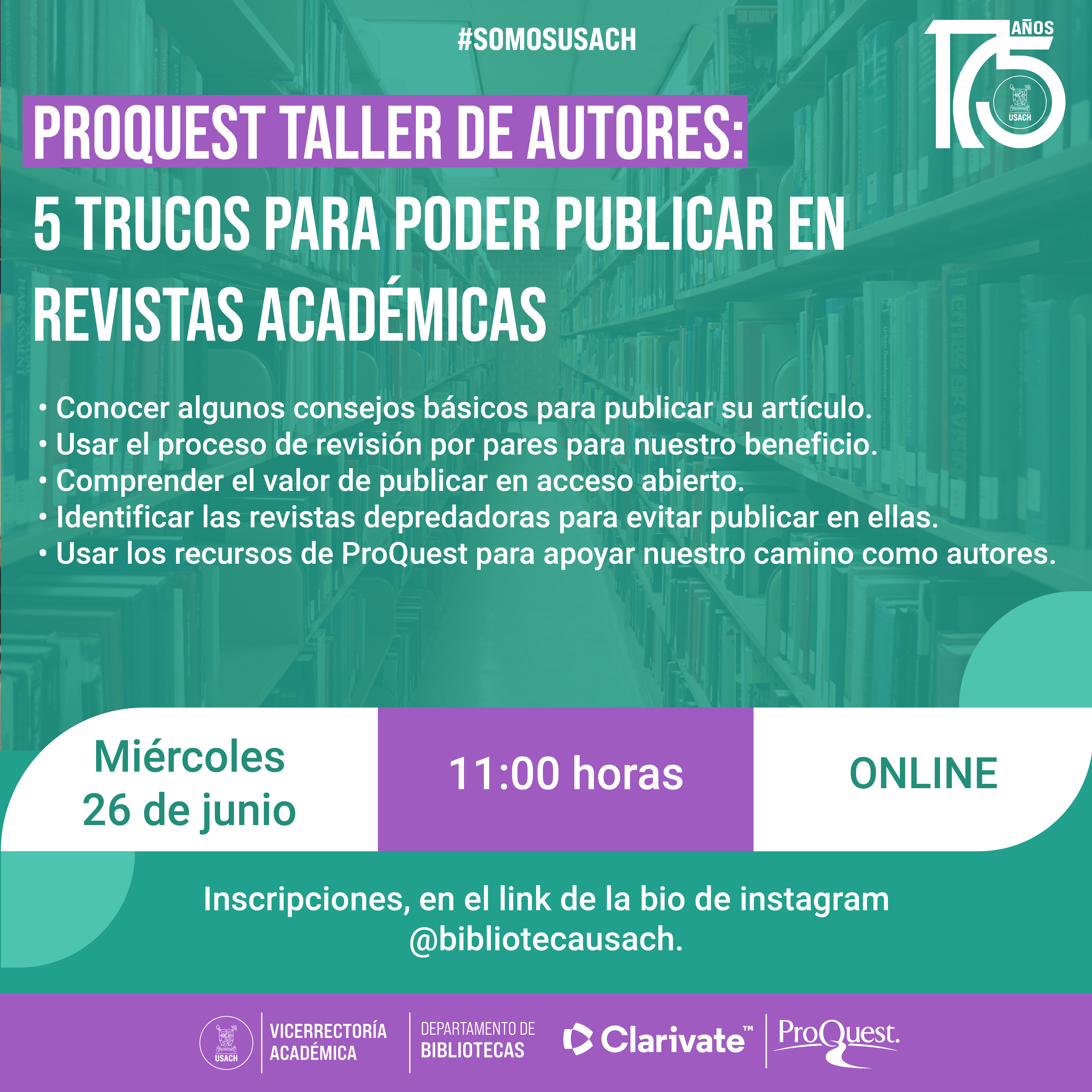 El Departamento de Bibliotecas, dependiente de la Vicerrectoría Académica, invita a participar en el taller "ProQuest taller de autores: 5 trucos para publicar en revistas académicas", impartido por Angélica Bermúdez, Customer Success & Training Manager de ProQuest. En esta oportunidad, los participantes aprenderán a utilizar el proceso de revisión por pares, comprenderán la importancia de publicar en acceso abierto y recibirán estrategias para identificar y evitar las revistas depredadoras.