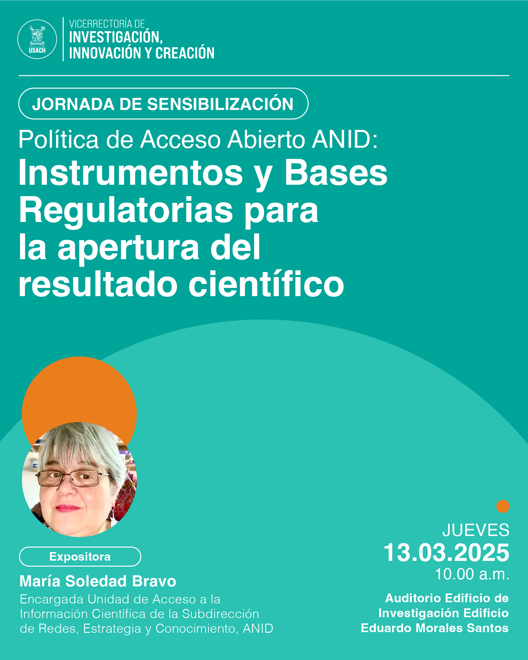 La Vicerrectoría de Investigación, Innovación y Creación (VRIIC) de la Universidad de Santiago de Chile invita a la comunidad universitaria a participar en la jornada de sensibilización sobre la Política de Acceso Abierto ANID, donde se abordarán los instrumentos y bases regulatorias para la apertura del resultado científico en Chile.