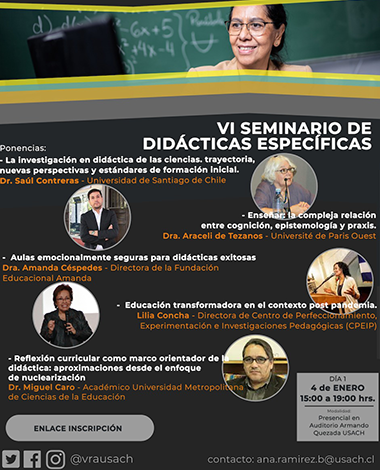 La actividad, abierta a toda la comunidad educativa, previa inscripción, contará con un completo programa de ponencias, a cargo de destacados exponentes nacionales e internacionales, quienes abordarán diferentes temáticas relativas a las didácticas, abarcando desde la investigación hasta la experiencia en aula, pasando por diversas perspectivas, tales como ciudadanía inclusiva, cognición y metacognición, entre otros.El seminario entregará una constancia de participación a sus asistentes, tanto en modalidad online como presencial. Para mayor información escribir al correo: ana.ramirez.b@usach.cl
