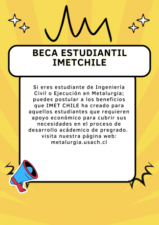 Si eres estudiante universitario de Ingeniería Civil o Ejecución en Metalurgia; puedes postular a los beneficios que IMET CHILE ha creado para aquellos estudiantes que requieren apoyo económico para cubrir sus necesidades en el proceso de desarrollo acádemico de pregrado. Los beneficios disponibles son: