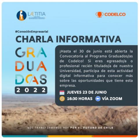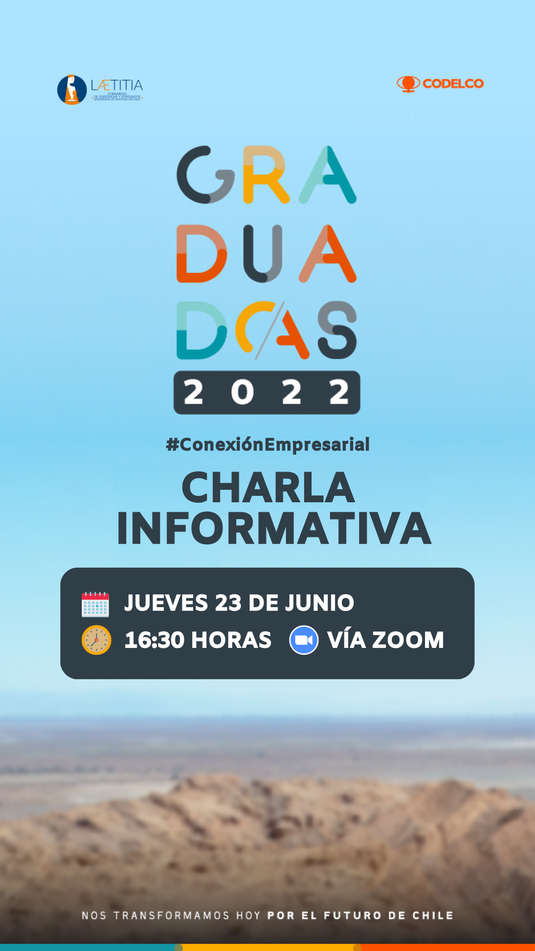 Te invitamos a esta actividad informativa para conocer más sobre las oportunidades que tiene esta empresa, la cual se realizará de forma digital el jueves 23 de junio a las 16:30 horas a través de ZOOM, y será presentada por Vanessa Veliz M., Jefa Proyecto Capital Humano Estratégico de Codelco.