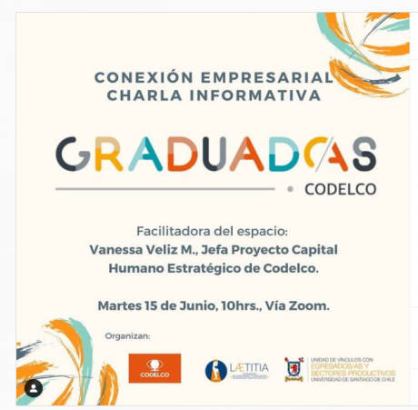 CODELCO – Corporación Nacional del Cobre de Chile y Laetitia, Egresados USACH, invitan a la comunidad de recién egresados/as de la Universidad de Santiago de Chile a participar de la Charla Informativa que dará a conocer el #ProgramaGraduados2021.