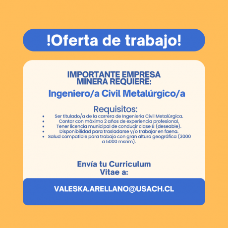 Importante empresa Minera está en búsqueda de Ingeniero/a Civil en Metalurgia, los y las interesadas deben enviar su curriculum vitae al correo:  valeska.arellano@usach.cl