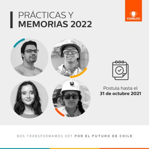 La convocatoria para ser parte de nuestras prácticas y memorias en 2022 ya está abierta. Te invitamos a incorporarte a nuestro proceso de transformación para aportar con tus talentos en la principal empresa productora de cobre del mundo. Postula hasta el 31 de octubre aquí: https://bit.ly/3DlA2hk